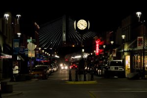 we found the motel, then went downtown to Bussards. Quite a wait, even at 8pm! It gave Rick a chance to plan his early morning shoot of the clock and street lights. I opted for it right then, so I could sleep in!